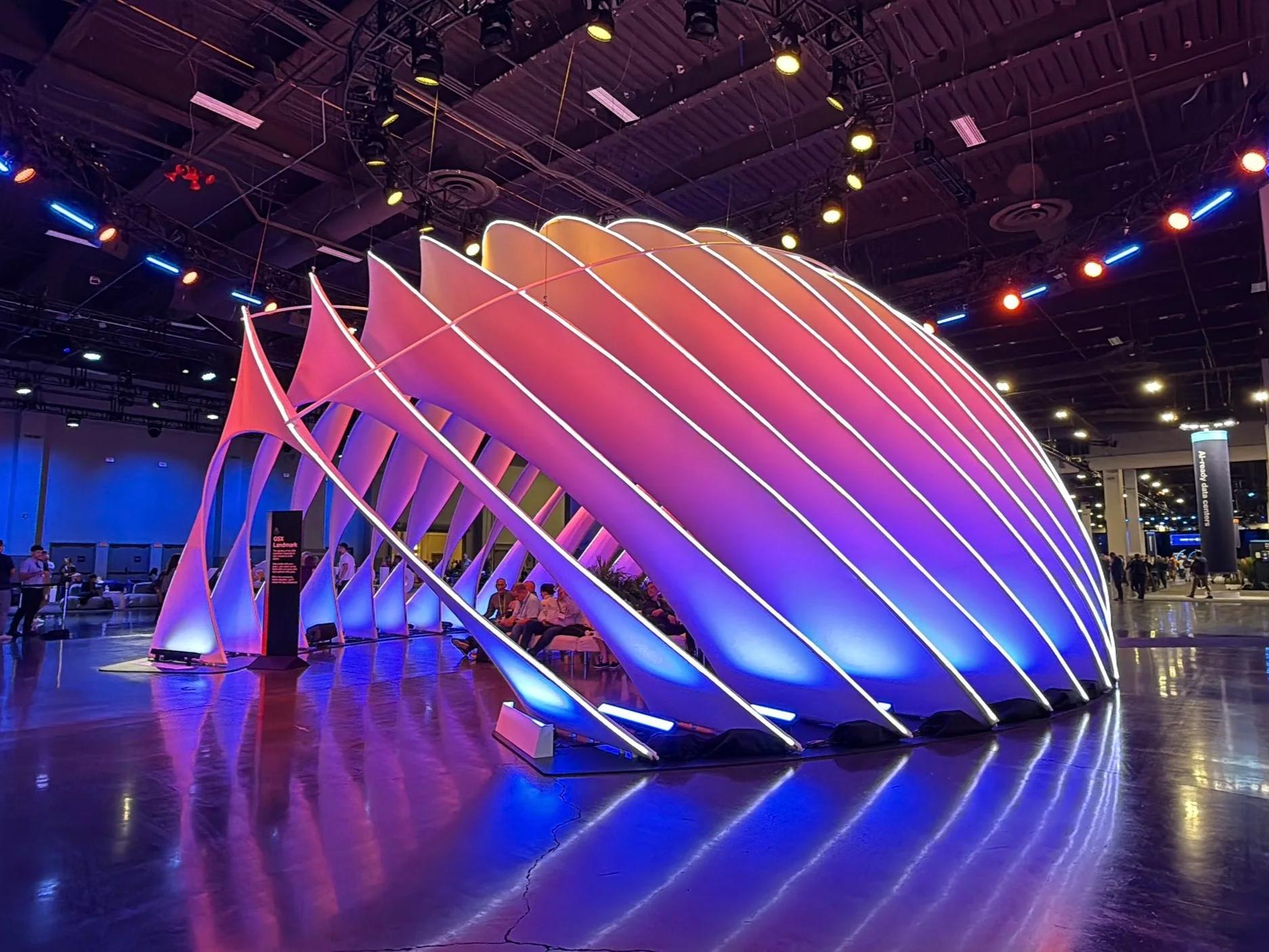 The Landmark was designed to bring the community together. To reflect the power of the community, the Landmark lighting responded to the density of people in the space. Once the density crossed a certain threshold, it triggered a crescendo of music and lighting effects. Software and hardware was reused from Cisco Live 2025. A proof of concept demo was built and presented in-person to the clients in under a week. All software development and creative design was done in-house by GPJ.