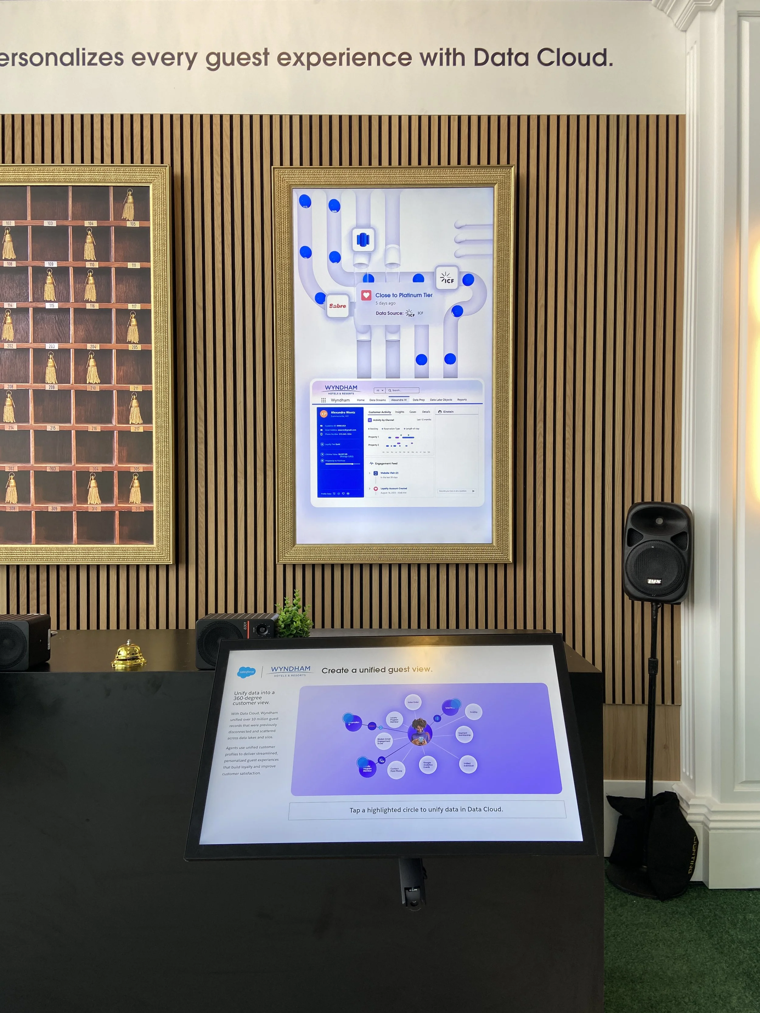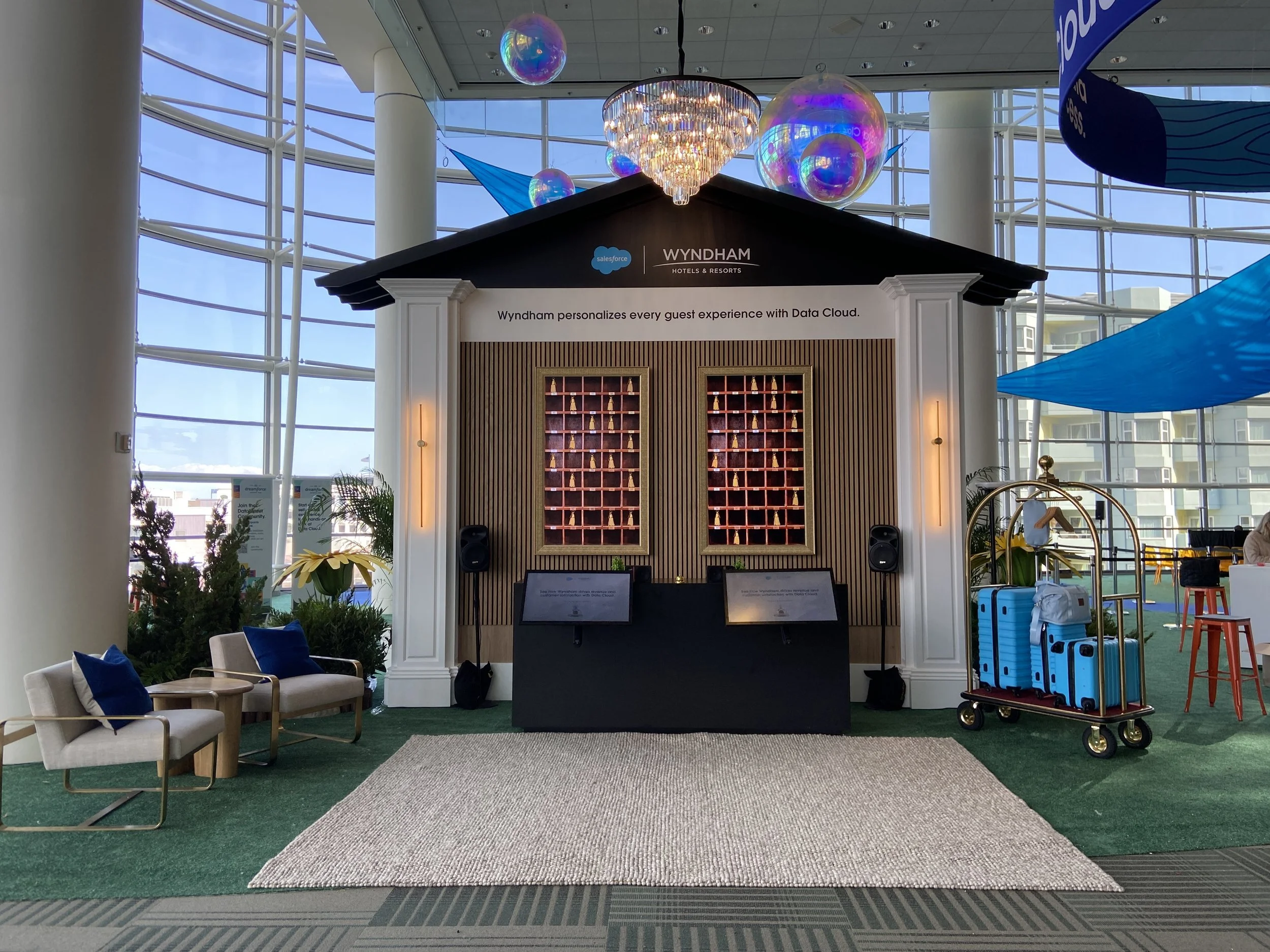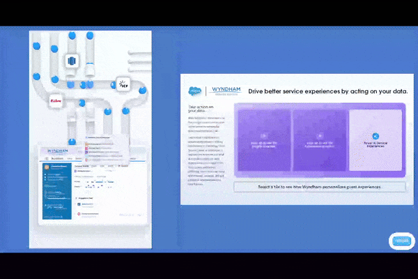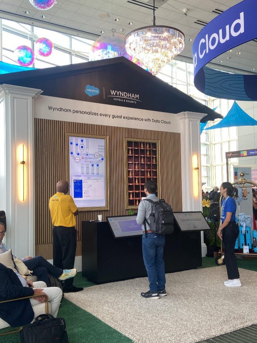 George P. Johnson Experience Marketing worked with Salesforce to develop an installation for their Data Cloud Zone Launch at Dreamforce 2024. This activation was a CSE for Wyndham to showcase how Wyndham uses Data Cloud to improve their business operations. The structure was comprised of two parallel kiosks, where each kiosk utilized both a touchscreen and a wall display. The CSE utilized extensive custom 2D and 3D animations and sound effects.